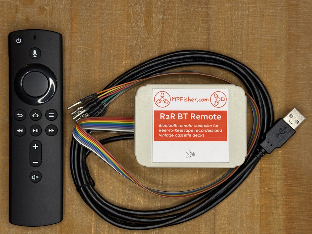 Remote controller and receiver designed for Reel-to-Reel tape recorders and vintage cassette decks. Allows control of all functions of tape recorder, including reverse-play, record and auto-mute. Bluetooth technology means that the receiver does not require direct line of sight or the remote and can be hidden out of sight. The cable which plugs to the remote input on the tape recorder is designed to be universal. It is terminated with individual, “bullet” pins which can be plugged to many different makes and models of tape recorders.